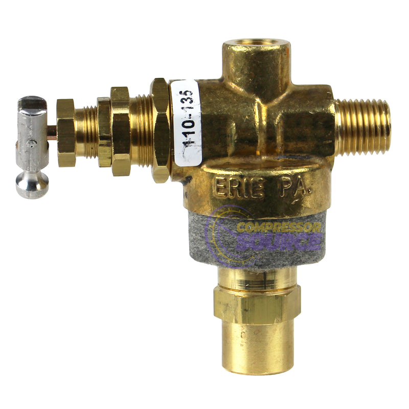 The valve features a 1/4" Male NPT thread for the tank connection and a 1/4" Female NPT unloader port. It also includes an optional 1/8" Female NPT throttle control port. The valve is factory preset to activate the compressor at 110 PSI and shut it off at 135 PSI, ensuring safe, efficient operation.
