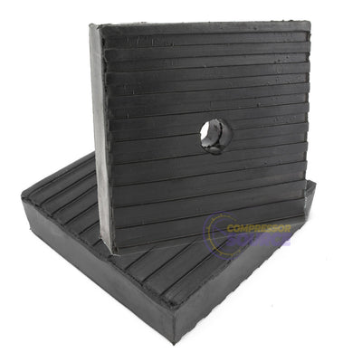 Pack of 2 industrial solid rubber anti-vibration pads. These anti-vibration pads measure 4" square and are 1" thick. These are solid rubber anti-vibration pads with an anti-skid top and bottom surface. Each of the pads has a 5/8" hole in the center so that you can easily anchor through the center of the pad. These are perfect for use with air compressors, HVAC, and all sorts of heavy-duty equipment. Using these vibration pads will cut down on operating stress, equipment wear, and noise with your machinery.
