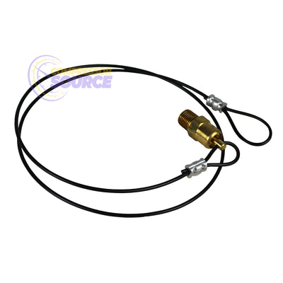 Heavy-duty 1/4" Male NPT pull-style air tank moisture drain with 36" poly-coated steel cable. This is a high-quality, solid brass, pull-style drain that can be used to replace any standard 1/4" drain or petcock. This is similar to other drains of this type; however, this drain features a heavy-duty, large brass body, as well as a thicker steel cable with a durable poly coating. This screws into the threads on the bottom of your tank, with this drain, you do not have to get on the ground and manually twist it open to release the moisture. All you do is pull on the cable and the unique design of the valve releases air pressure and moisture. When you release the cable the drain valve automatically seals itself and does not let any air pass through. This is a high-quality valve that is made in the USA. The solid brass construction along with the 36" poly-coated steel cable ensure a long life and years of reliable performance.