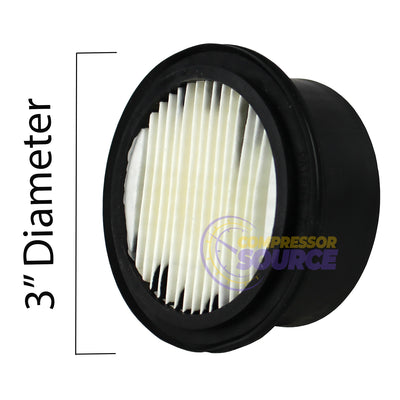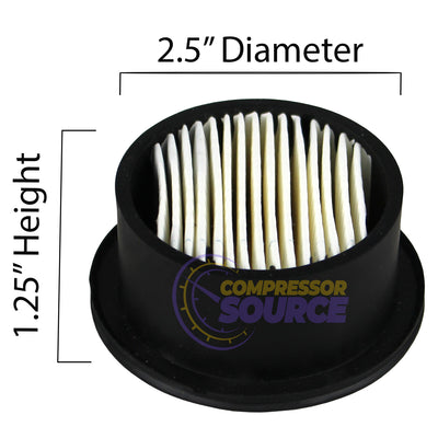 Brand new Solberg 06P pancake style air intake filter element. This filter is 1.25" thick and measure 3" outside diameter at the widest point. The lower part of this filter element that sits in the housing measures 2.5" outside diameter. This filter element will work with any air compressor that requires a pancake style filter of this size.