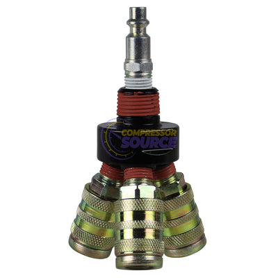 Prevost A15-201 three-way compressed air splitter manifold with steel 6-ball bearing couplers and plug, "Complete Kit". This is a high-quality compressed air line splitter that can be used to run up to 3 lines out of one. This is a great accessory to have for your airline system and is extremely versatile. As you can see in the photos, this manifold makes it possible to turn one air compressor line into three. You can easily connect this to a single airline and operate multiple lines for tools and accessories. This is a great option for when you need a few people working off of one compressor at the same time. Whether you're working in your home garage, shop, industrial setting, or on a job site, this is a great manifold to have on hand. Using this manifold can increase productivity at your work site and allow you to have more people working! This kit includes three solid steel, 6 ball bearing couplers, a Prevost A15-201 3-way manifold, and a 1/4" Industrial style plug.