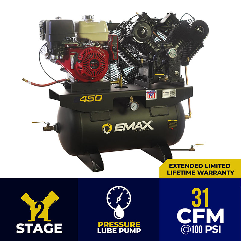 Introducing the EMAX Industrial 13 HP 2-Stage 30-Gallon Truck Mount Gas Powered air compressor, a powerful and portable solution designed for industrial-grade pneumatic applications. With a robust 13 HP gas engine and a two-stage pump, this compressor delivers consistent and reliable air supply for demanding tasks. Its compact and truck-mountable design makes it ideal for mobile operations, ensuring you have access to compressed air wherever your work takes you. Please see below for more features and specifications.